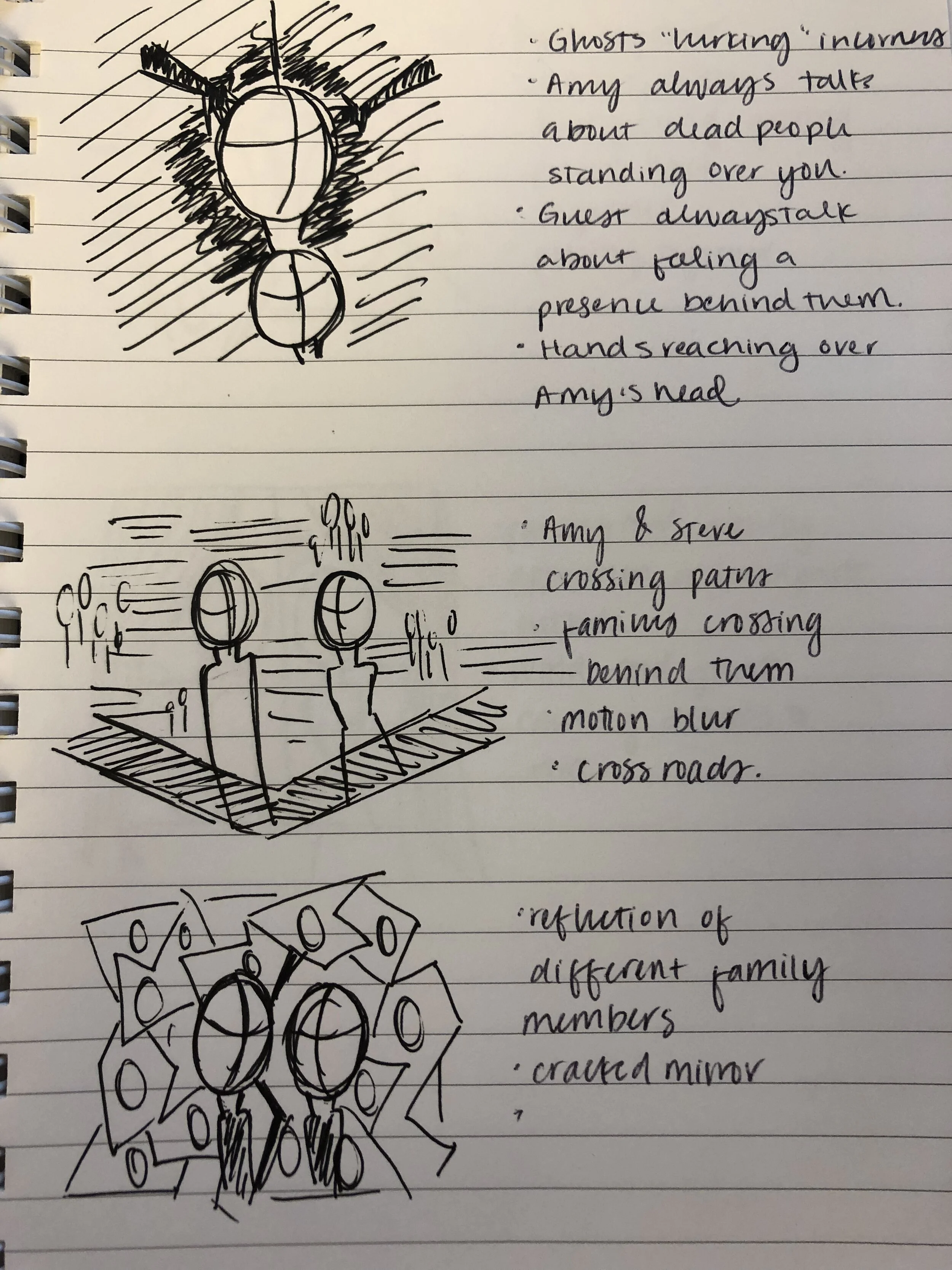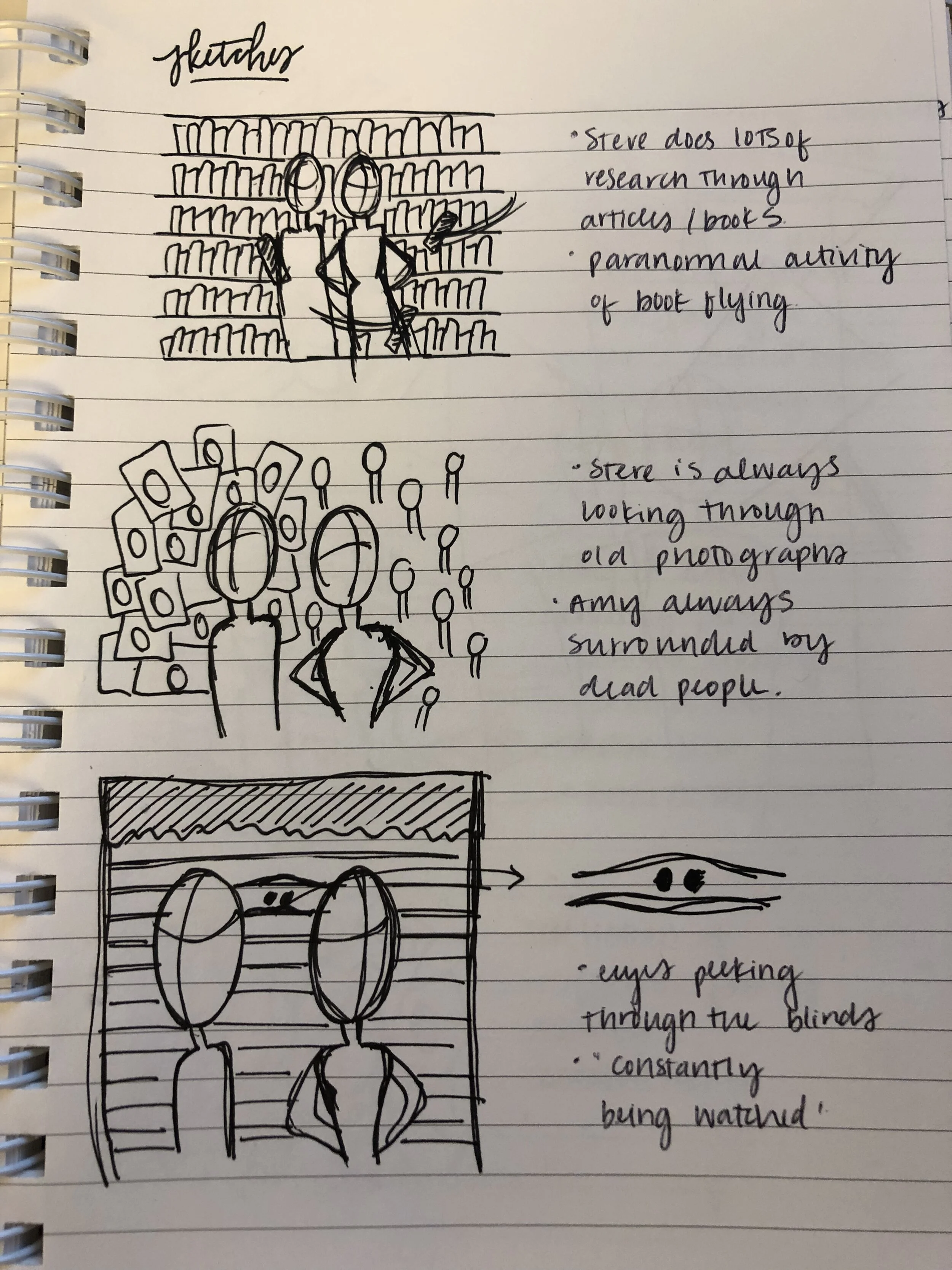 After watching one too many episodes of The Dead Files, brainstorming became my first task at hand. Not being much of an illustrator, I found this step in the workflow the most difficult. Capturing and sketching out all of my ideas is not a skill I practiced often, and I’m grateful to have supportive mentors guiding me through this process..