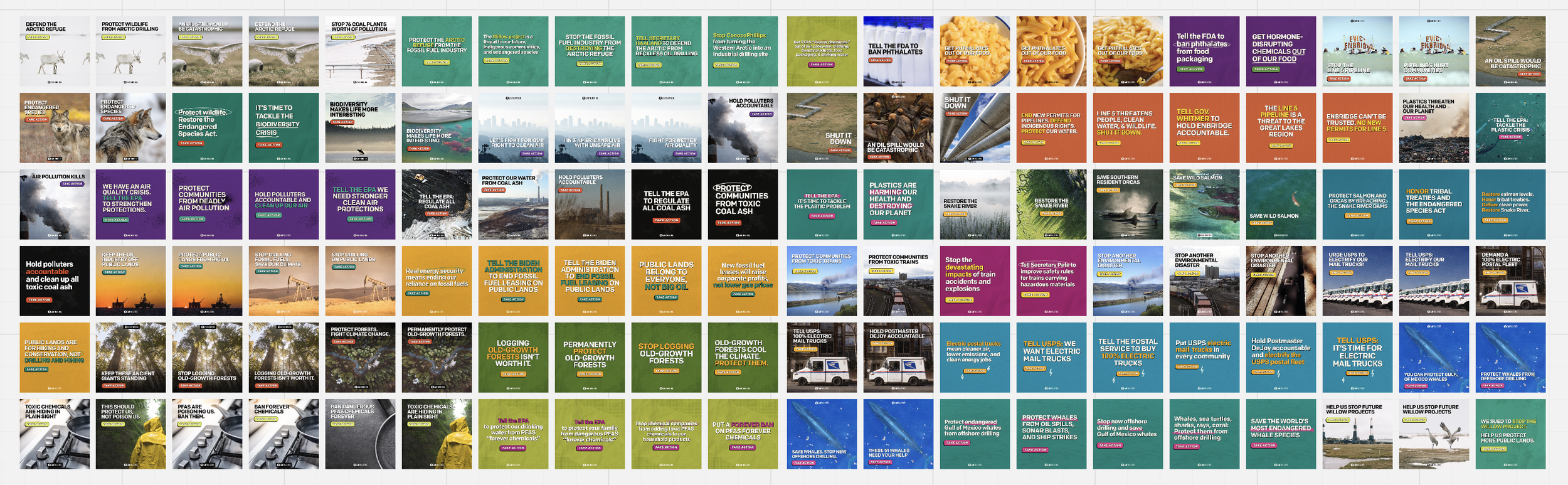 Beginning in 2022, the Digital Advocacy team made a big investment to use advertising to bring new advocates to Earthjustice. A huge portion of our email and SMS subscribers come from advertising, and it’s a successful way to ask them to take more advocacy actions in support of different issues. Grassroots advocacy can largely influence policy and litigation & educate folks about our work and other environmental issues. Where I came in, I worked on designing all the variations of ads for each action alert for our first year. The following year (FY23), I took more of an Art Director role and hired contractors to do the production of assets.